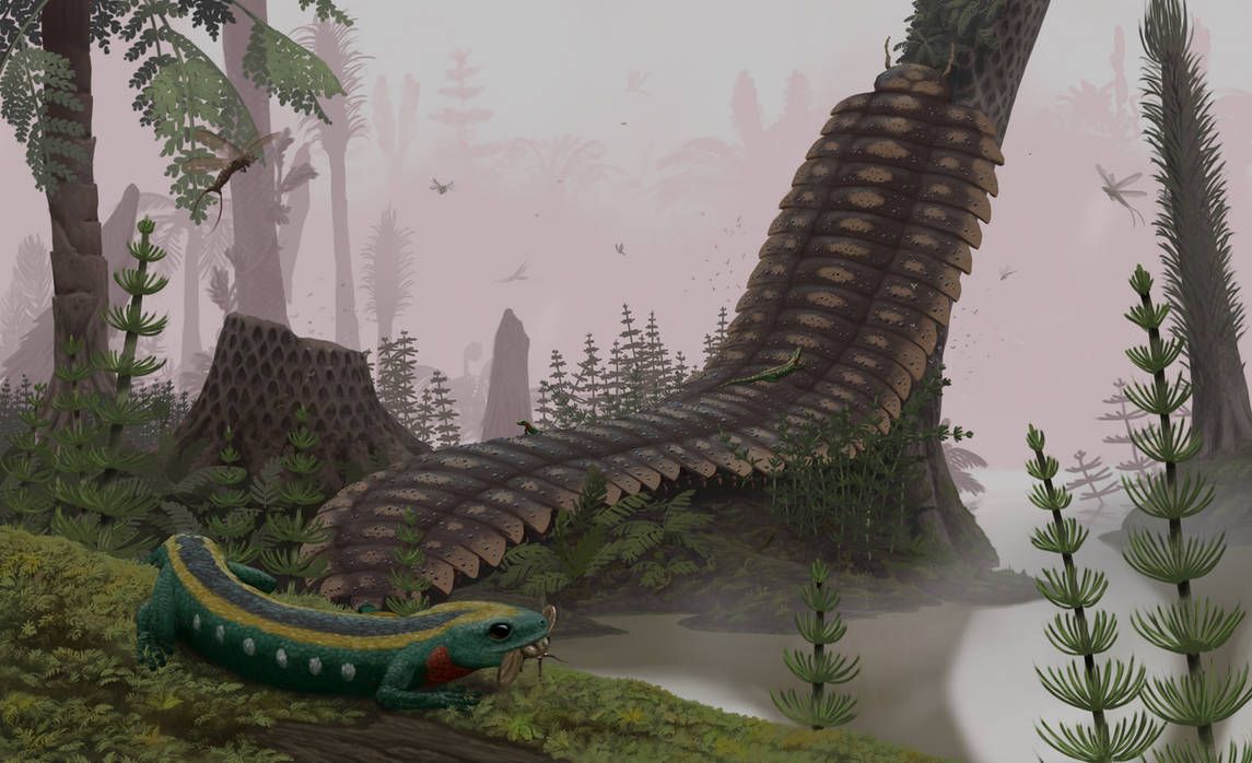 Einer der auffälligsten Bewohner war Arthropleura, ein riesiges, gliederfüssiges Tier, das mit bis zu 2,5 Metern Länge als grösstes landlebendes wirbelloses Tier der Erdgeschichte gilt. Es war wahrscheinlich ein Pflanzenfresser und durchstreifte den Waldboden auf der Suche nach abgestorbenem Pflanzenmaterial (4).