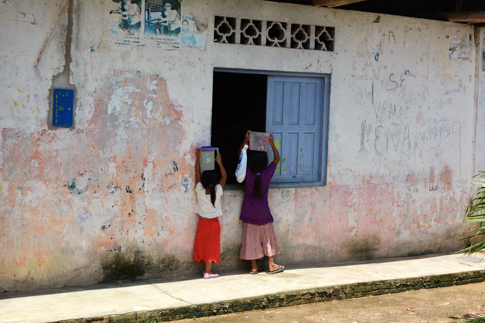 Zwei kleine Mädchen transportieren Wasser in Eimern. Obwohl das Dorf am Ufer des Nanay-Flusses liegt, einem Nebenfluss des Amazonas, gibt es in der Region zu wenig sauberes Trinkwasser. Foto, 2015, aufgenommen in Padre Cocha, einem kleinen Dorf in der Nähe von Iquitos im peruanischen Amazonasgebiet. (© Mariel Ruiz-Gonzalez).